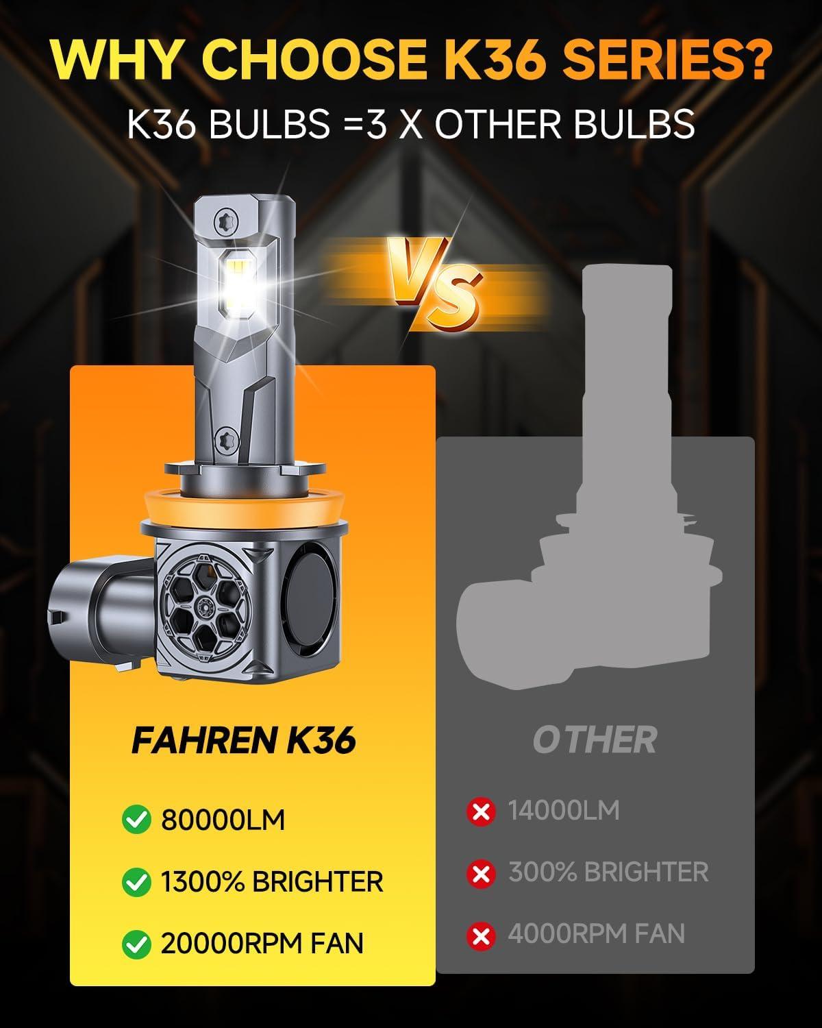 🚀【90000LM 5th-Gen Extreme Brightness】Powered by FAHREN’s upgraded 5th-generation K36 chip, these H11 H9 LED bulbs deliver up to 90000 lumens per set, providing wider, longer, and clearer road visibility for safer night driving.