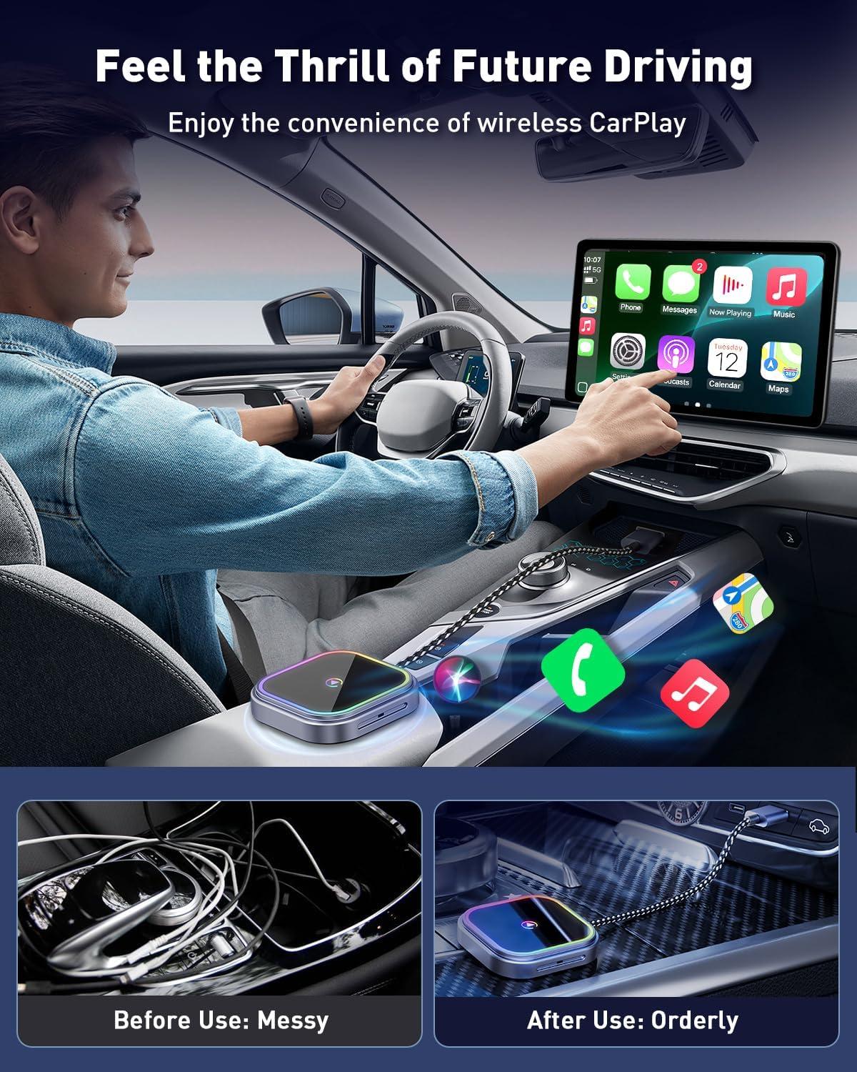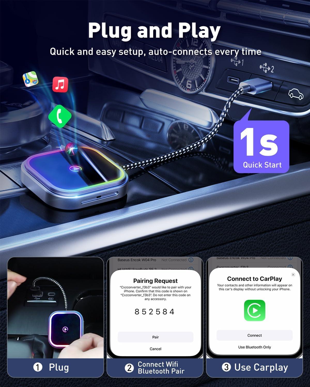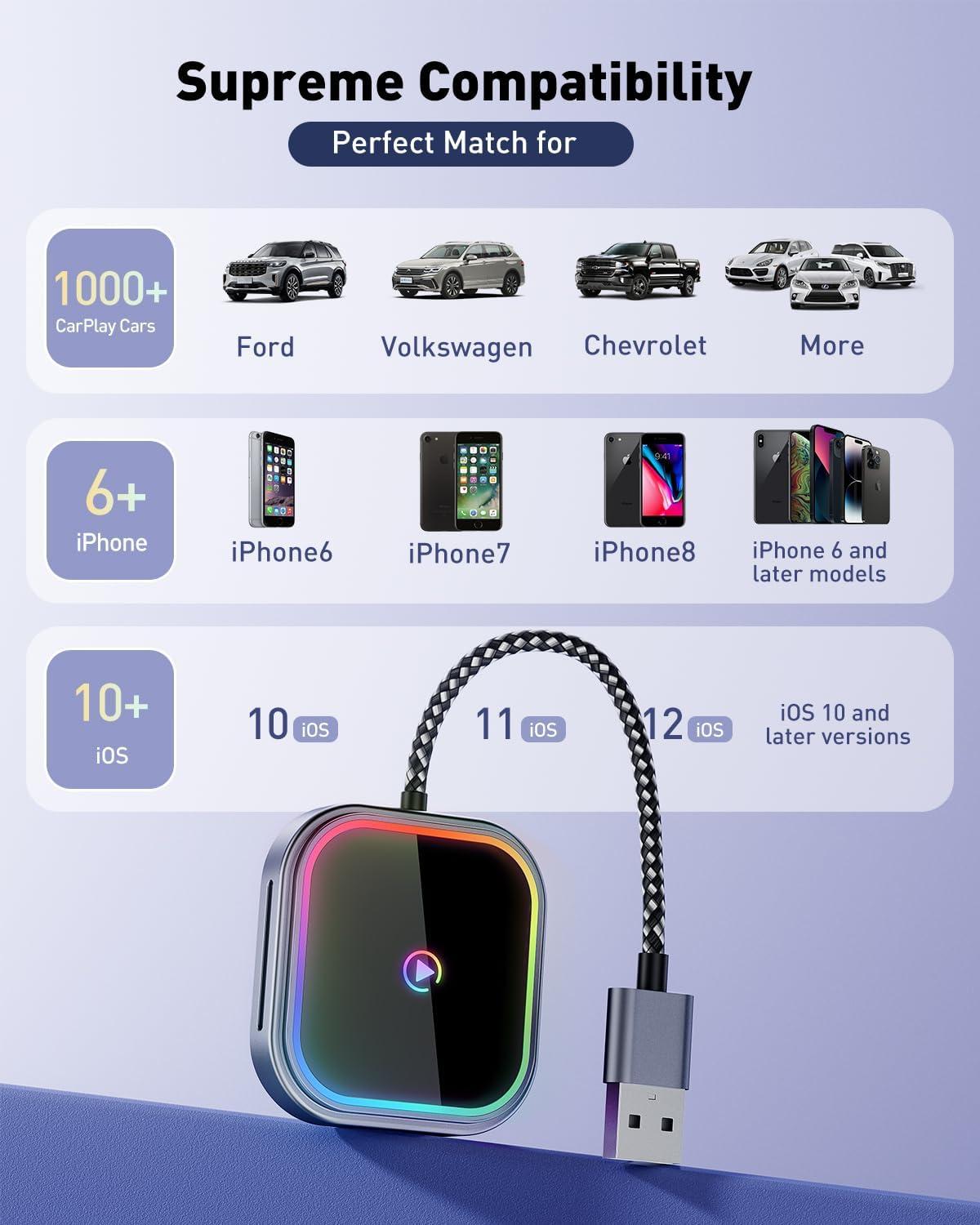 【Universal Compatibility & Effortless Setup】Our wireless CarPlay adapter supports over 1200 car models with wired CarPlay functionality. Whether you're in a sedan or SUV, this adapter instantly converts your wired connection to wireless—without requiring any complicated installations or modifications. Just plug it in, pair your iPhone or Android, and enjoy CarPlay like never before!