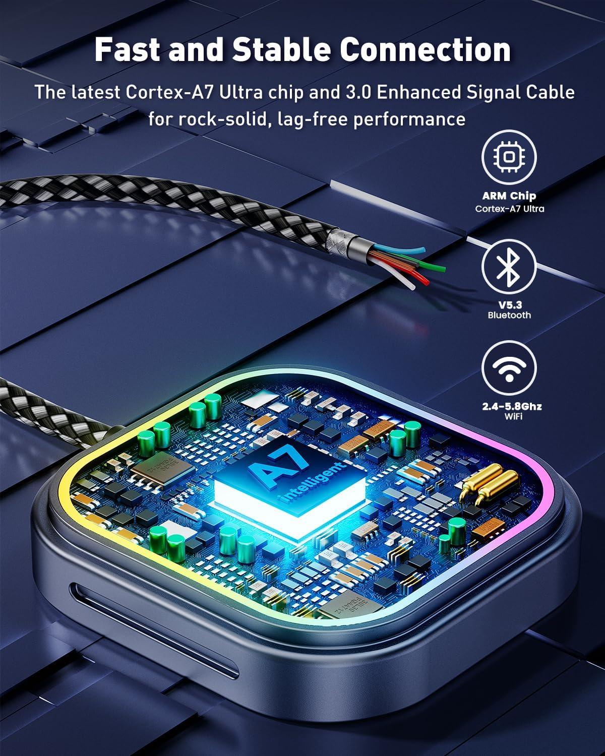 【Ultra-Fast & Reliable Connectivity】Powered by the advanced ARM Cortex-A7 Ultra chip and a cutting-edge 3.0 Enhanced Signal Cable, the carplay adapter delivers lightning-quick connection speeds. Enjoy faster app launches, smoother media control, and lag-free navigation. With automatic reconnection in just 3 seconds after you start your car, your wireless CarPlay experience is always ready when you are—effortlessly reliable, every time.