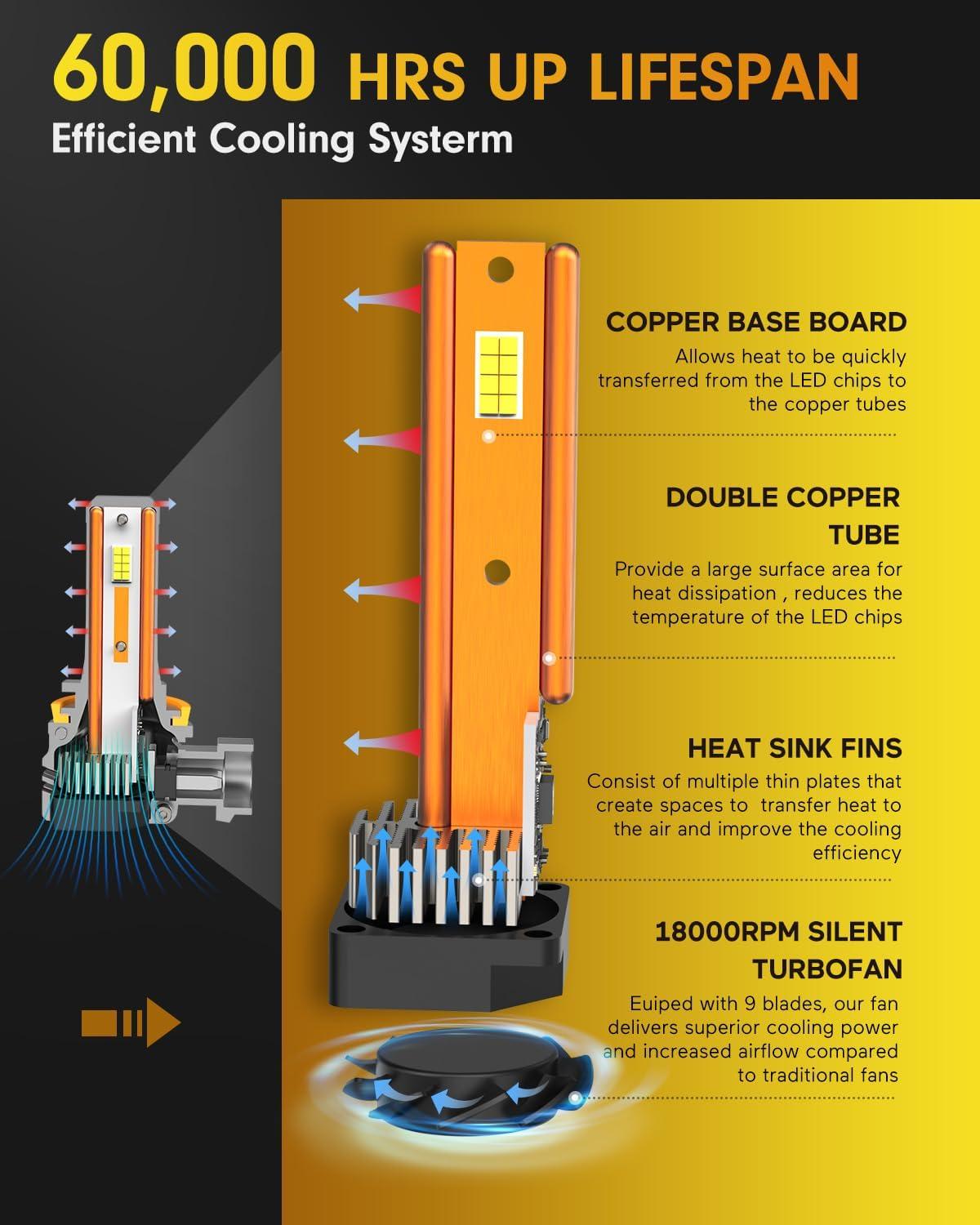❄️【Triple Cooling System, 85,000+ Hour Lifespan】FAHREN 9005 HB3 & H11/H8/H9 LED Light Bulbs adopt aviation-grade aluminum + dual copper heat pipes, dissipating heat 900% better than plastic alternatives. Paired with aluminum fins and a 22,000RPM 9-blade silent fan, the triple cooling system ensures stable high-power performance even during extended use. The aerodynamic fin design enhances durability, while the corrosion-resistant metal body fights aging. With IP68 waterproofing for all-weather reliability and 85,000+ hours of lifespan (10-year durability), these bulbs deliver long-lasting, low-brightness-loss, energy-efficient operation—ideal for drivers chasing enduring performance.