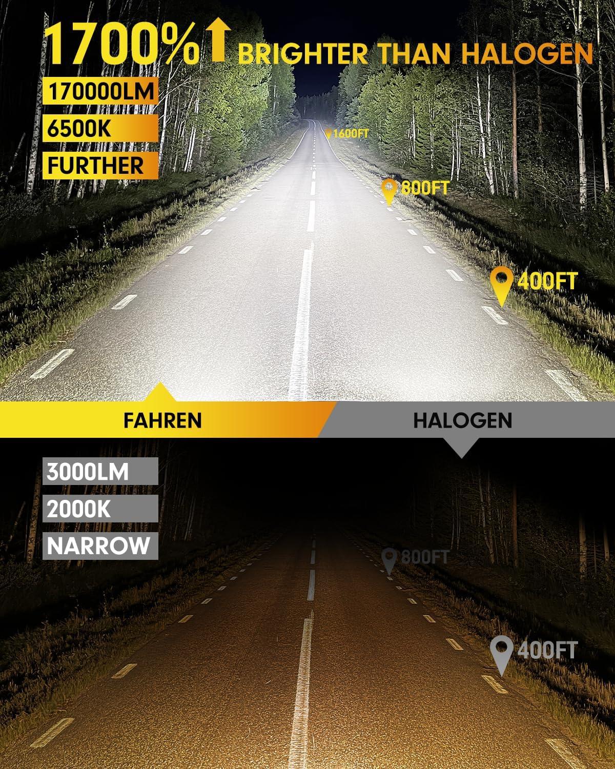 💡【H11 9005 1700% Brighter with 20S-Pro Chip—170,000LM】Designed for quality, not quantity — the H11/H8/H9 9005 /HB3 LED bulbs feature 16 high-performance chips powered by the advanced Fahren 20S Tech chipset. These bulbs are 17X brighter than stock halogen bulbs, providing superior visibility. With optimized heat dissipation, they maintain consistent brightness in all climates, even under extreme heat or cold. This groundbreaking brightness ensures ultra-clear visibility, improving safety during nighttime driving and harsh weather conditions.