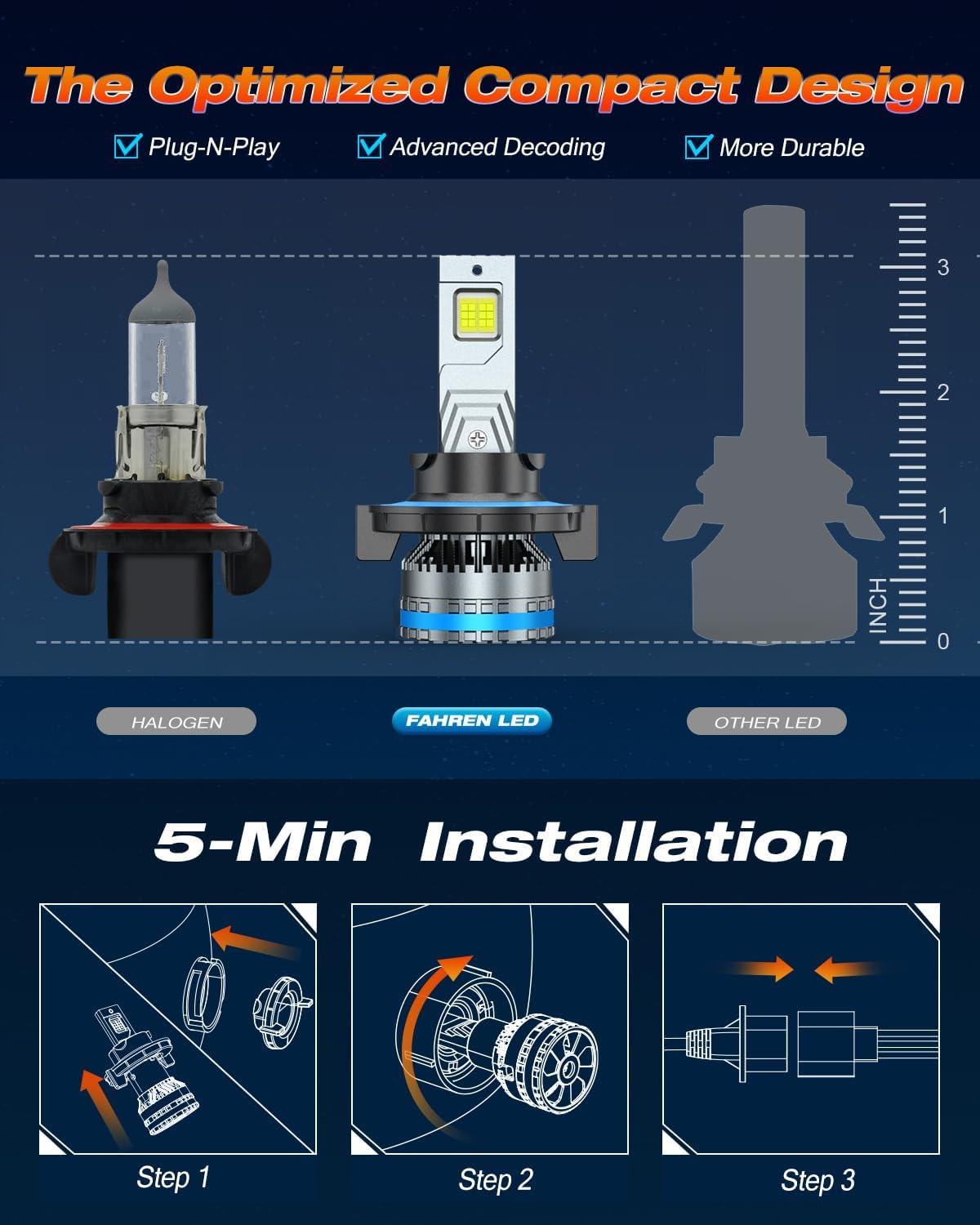 Quick & Easy Installation in 10 Minutes: These H13 9008 bulbs are designed for a seamless plug-and-play installation, closely mimicking the fit of factory bulbs. Equipped with a decoder, installation is fast and hassle-free, taking just 10 minutes.