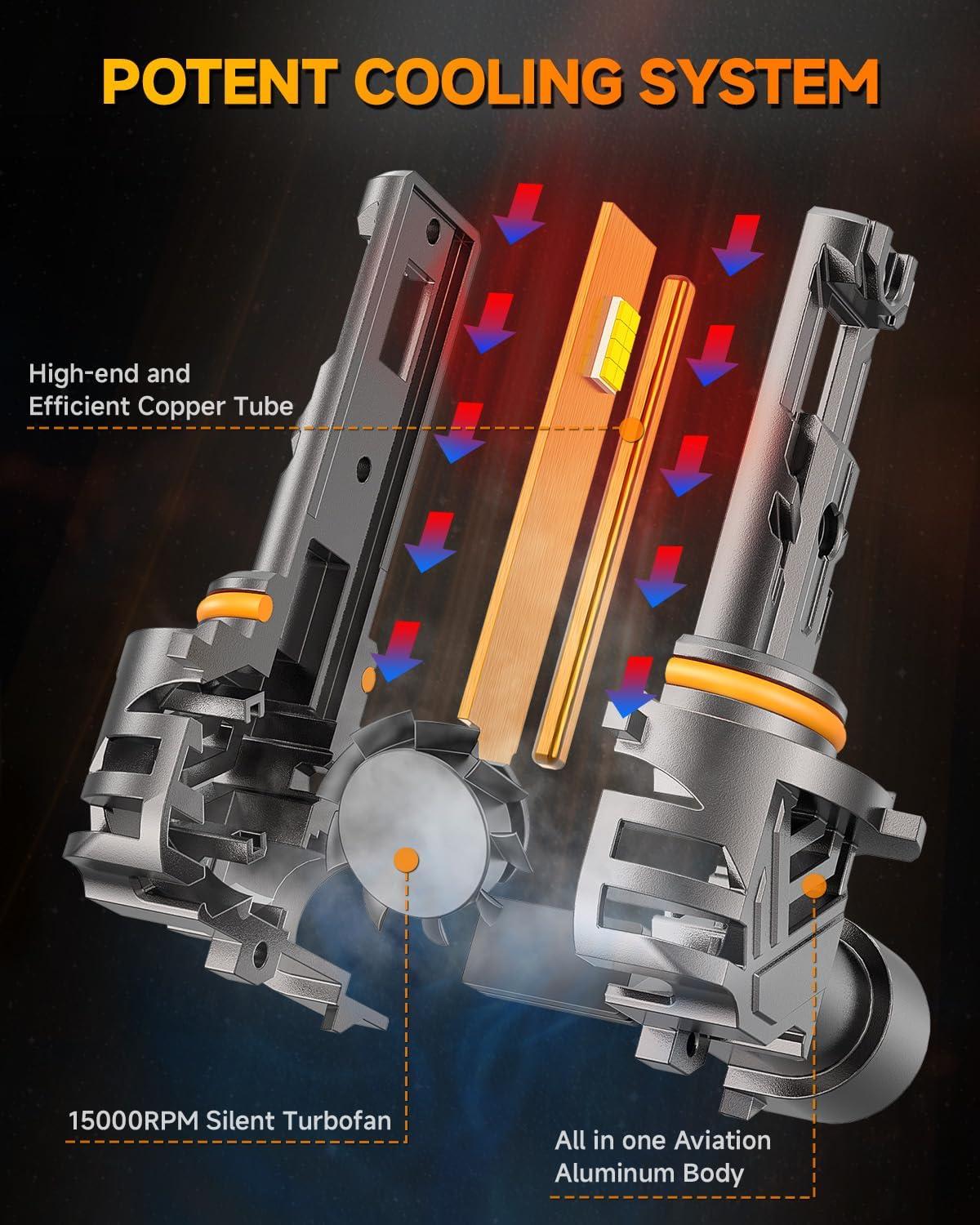 【10+ Years Longer Lifespan】Utilizing premium aviation aluminum as the main body and featuring a large copper baseboard for extensive heat dissipation. Coupled with a 15,000RPM high-speed cooling fan, it enhances heat dissipation efficiency. New upgraded FAHREN 9005 9006 Light bulb ensures a lifespan exceeding 60,000 hours of continuous illumination and stable operation. Bid farewell to the inconvenience of frequent replacements.
