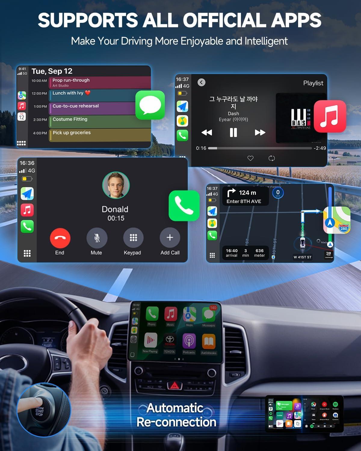 【2-in-1 Wireless Adapter】: This upgraded Bluetooth adapter seamlessly integrates with Apple CarPlay and Android Auto, effortlessly switching between Apple and Android devices. Connect in just 3 seconds. Activate CarPlay via voice assistant, touchscreen, buttons, or rotary knob to easily access navigation, music playback, and phone calls—ensuring a more enjoyable and safer journey.