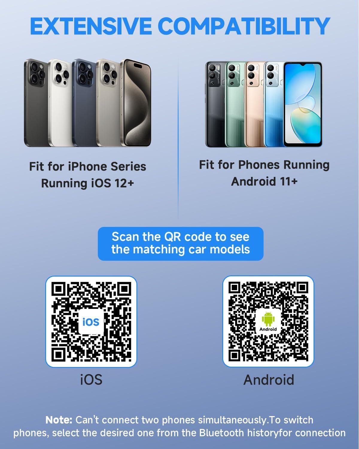 【WIDE COMPATIBILITY & WARRANTY】This universal CarPlay adapter works with 1,000+ car models and supports iOS 12+ / Android 11+. Includes a USB-C adapter and 24-month warranty for total peace of mind.