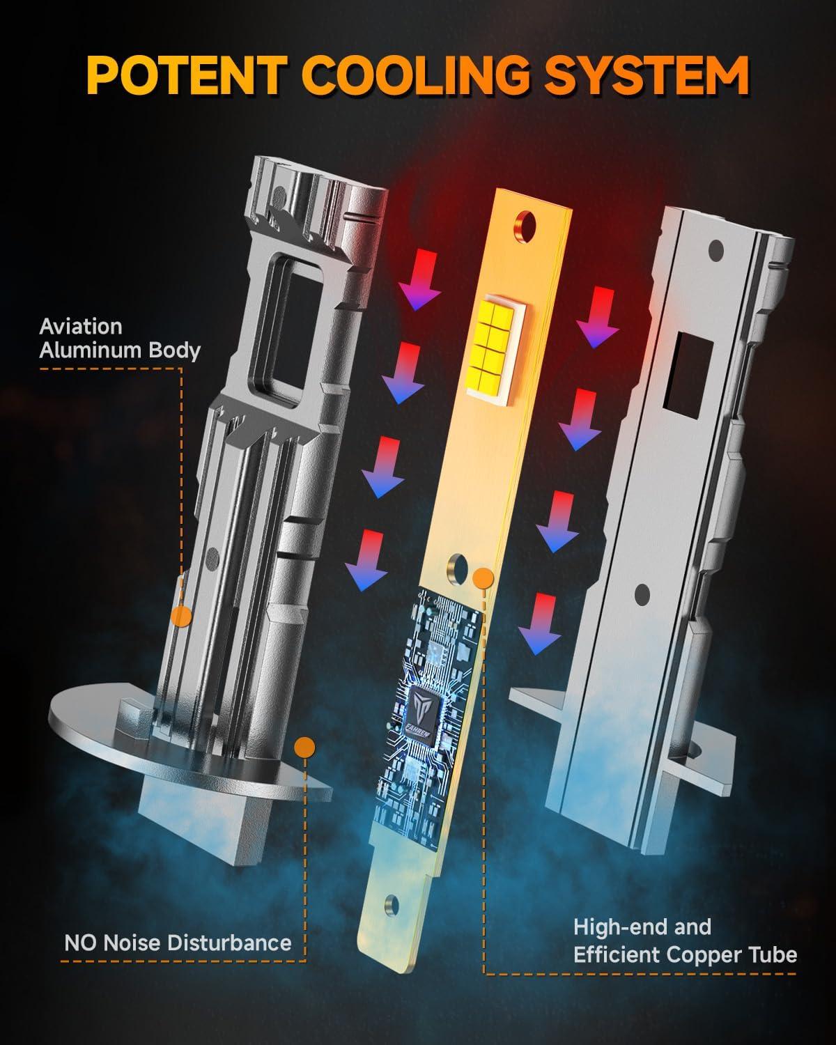 【10+ Years Longer Lifespan】Utilizing premium aviation aluminum as the main body and featuring a large copper baseboard for extensive heat dissipation. Coupled with a 15,000RPM high-speed cooling fan, it enhances heat dissipation efficiency. New upgraded FAHREN H11 bulb and 9005 bulb ensures a lifespan exceeding 60,000 hours of continuous illumination and stable operation. Bid farewell to the inconvenience of frequent replacements