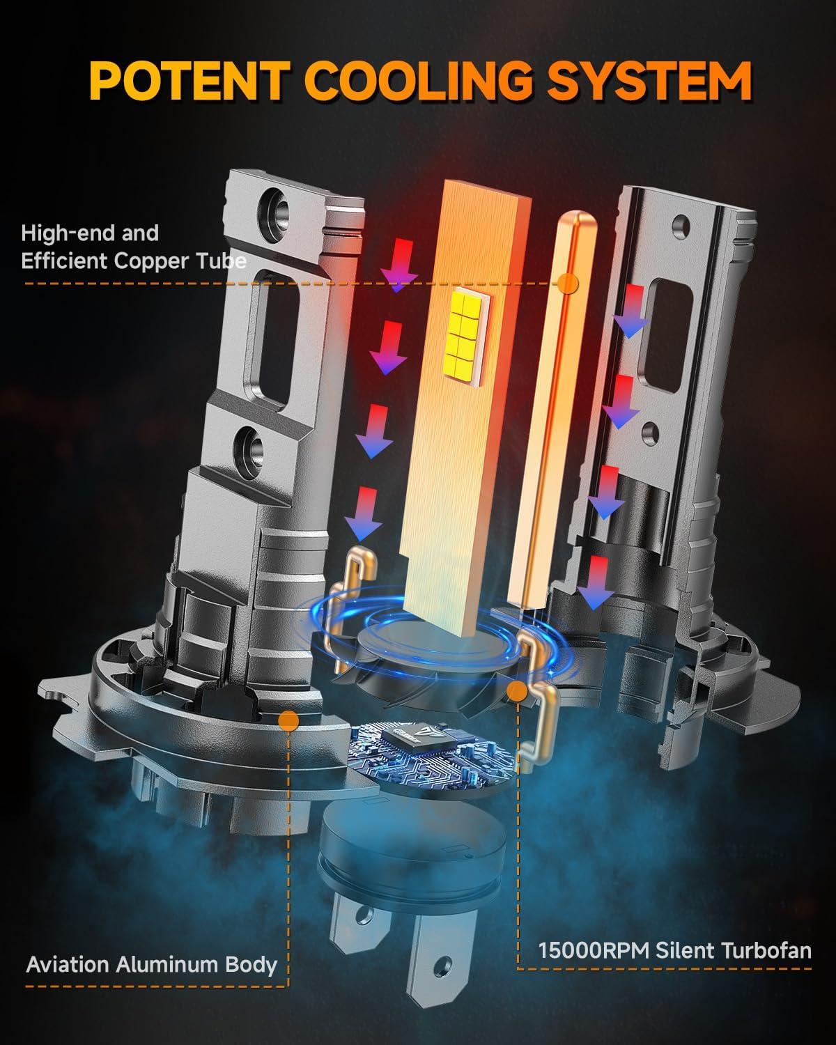 【10+ Years Longer Lifespan】Utilizing premium aviation aluminum as the main body and featuring a large copper baseboard for extensive heat dissipation. Coupled with a 15,000RPM high-speed cooling fan, it enhances heat dissipation efficiency. New upgraded FAHREN H11 bulb and 9005 bulb ensures a lifespan exceeding 60,000 hours of continuous illumination and stable operation. Bid farewell to the inconvenience of frequent replacements