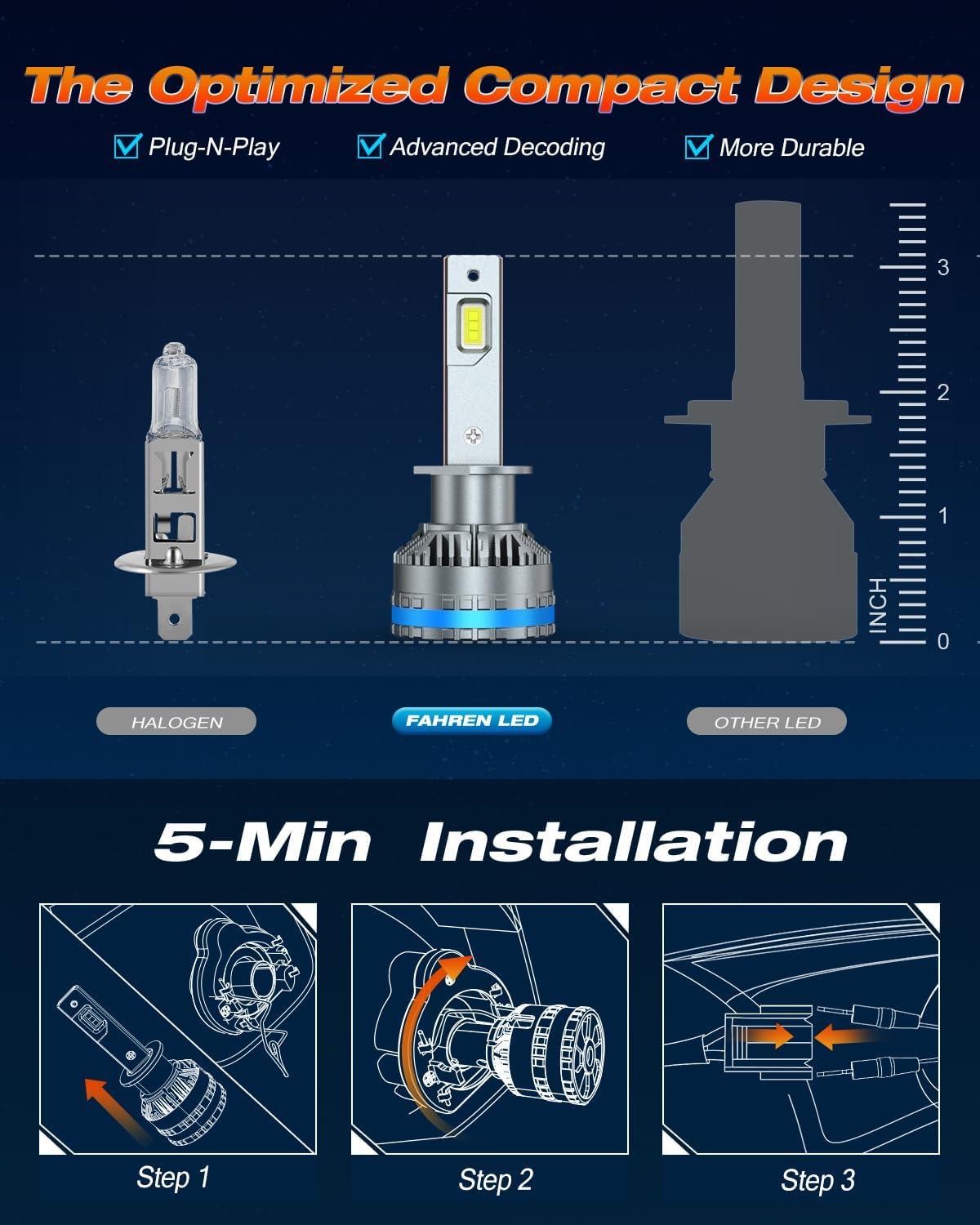 FAHREN 2025 Upgraded H11/H9/H8 LED Bulbs, 80000LM 1000% Ultra-Bright, Real 1:1 Mini Size, H11 Light Bulb Halogen Replacement, 6500K Cool White, Quick Install No Adapter Needed, Pack of 2(9012/HIR2)