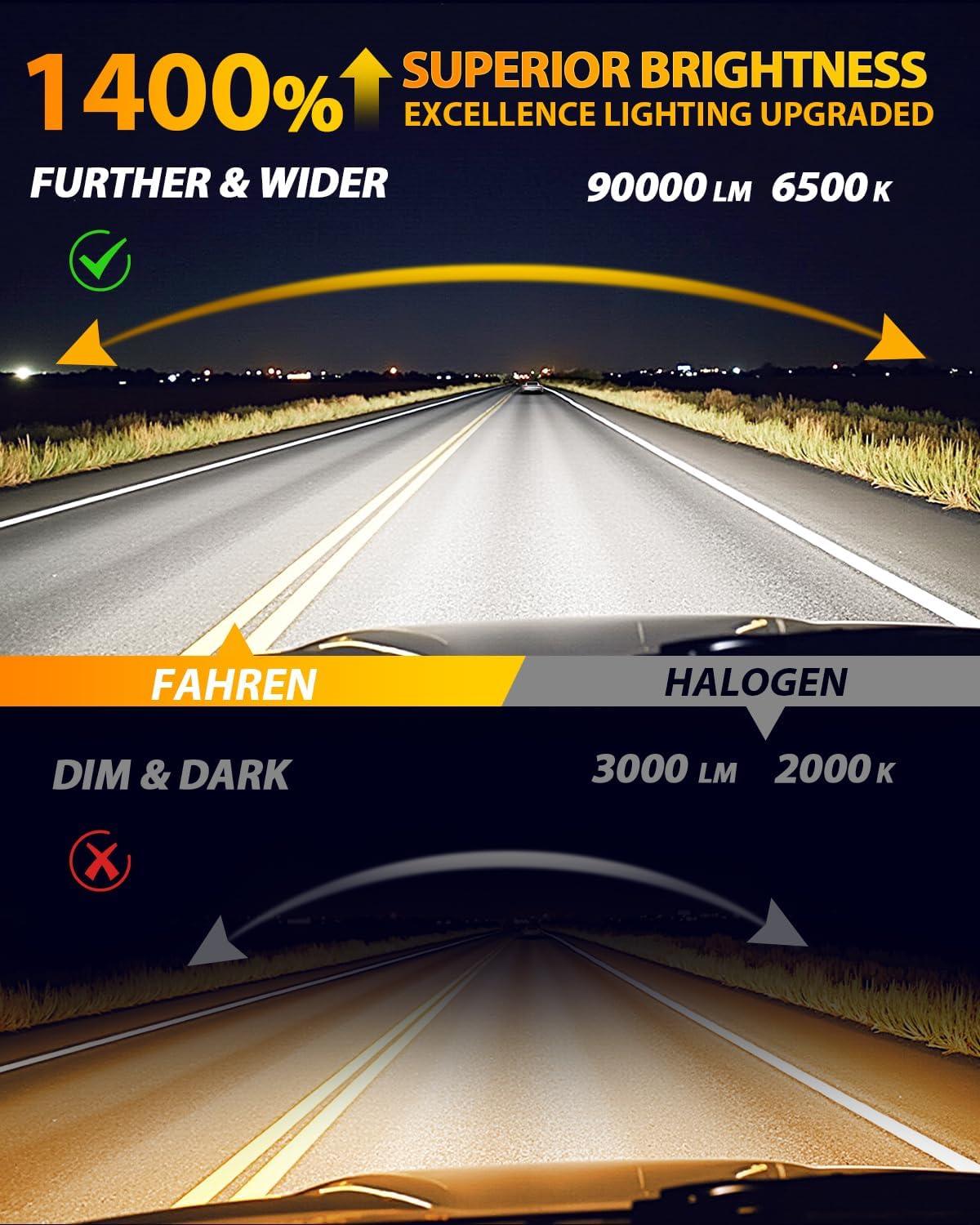 Exceptional 90,000 Brightness Experience the power of upgraded LED technology with our H11. Equipped with 6 high-performance chips, these bulbs produce an impressive 90,000 lumens—14 times brighter than conventional halogen bulbs. Whether you're navigating through dark roads or poor weather conditions, the intense beam provides unbeatable visibility and safety.