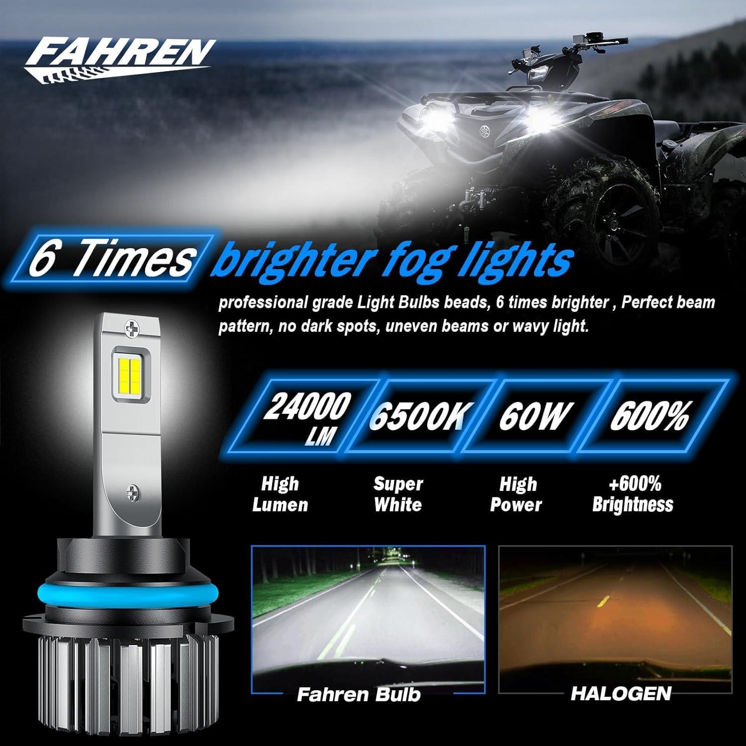 300% Brighter Than Others: Fahren H7 fog light bulbs made with high quality automotive grade Light chips, with 60W. 6500K, super focused beam pattern design allows you to see further and clearer for safe driving. Three times brighter than other bulbs.